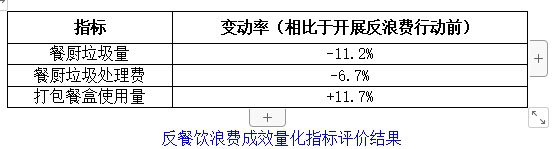 数据显示,在制止餐饮浪费的举措实施后,调研企业的:餐厨垃圾量平均减少了11.2%,垃圾处理费平均减少了6.7%,打包餐盒使用量平均增加了11.7%,反餐饮浪费系列行动成效较为显著。