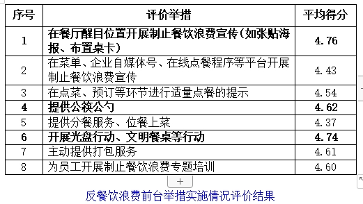 《报告》显示,在服务环节反浪费举措方面,调研共设置了8项餐饮服务中常见的前台反浪费举措供企业评价。调研结果显示,企业在“餐厅醒目位置开展制止餐饮浪费宣传(如张贴海报、布置桌卡)”、“开展光盘行动、文明餐桌等行动”和“提供公筷公勺”三大方面表现突出,这三项的平均得分分别为4.76、4.74和4.62,位列前三名。