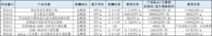 其中,样品10益生菌冻干粉的活菌量检测结果为2.2万CFU/g,对应的送检产品为养庆堂益生菌冻干粉(2024年10月23日生产),其包装标示的生产时活菌添加量≥30000亿CFU/盒,换算下来为≥750亿CFU/g。