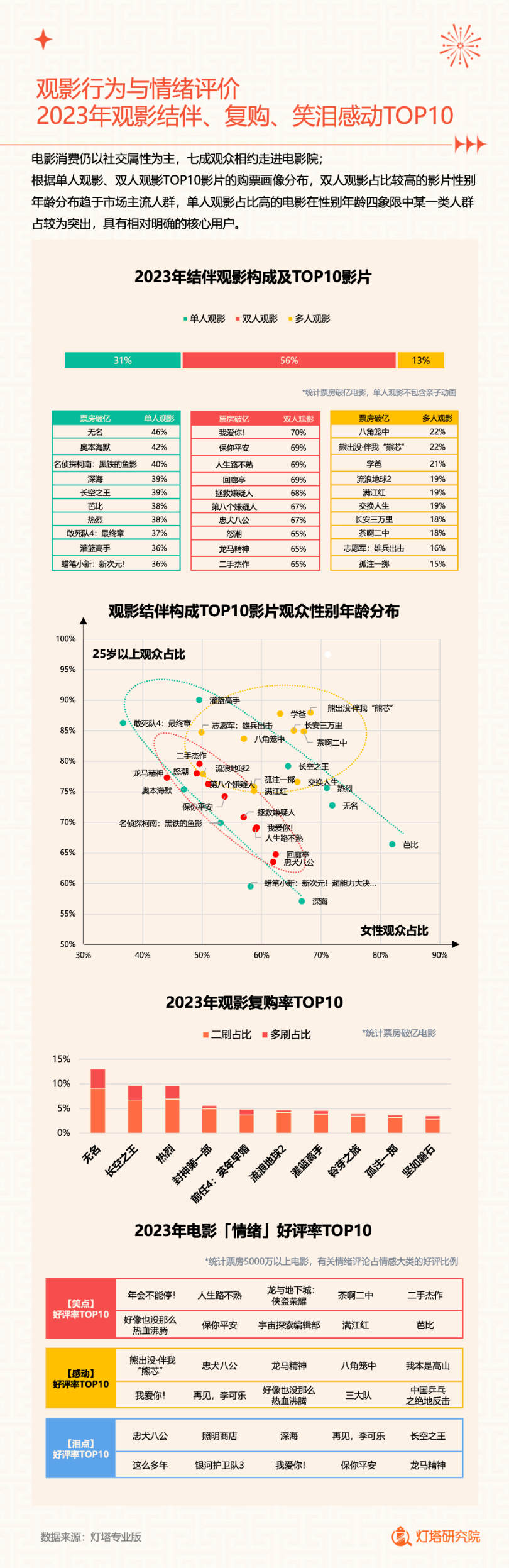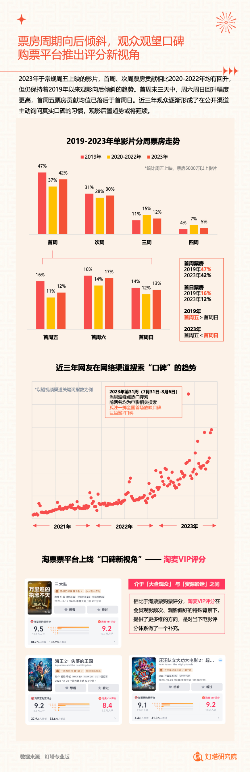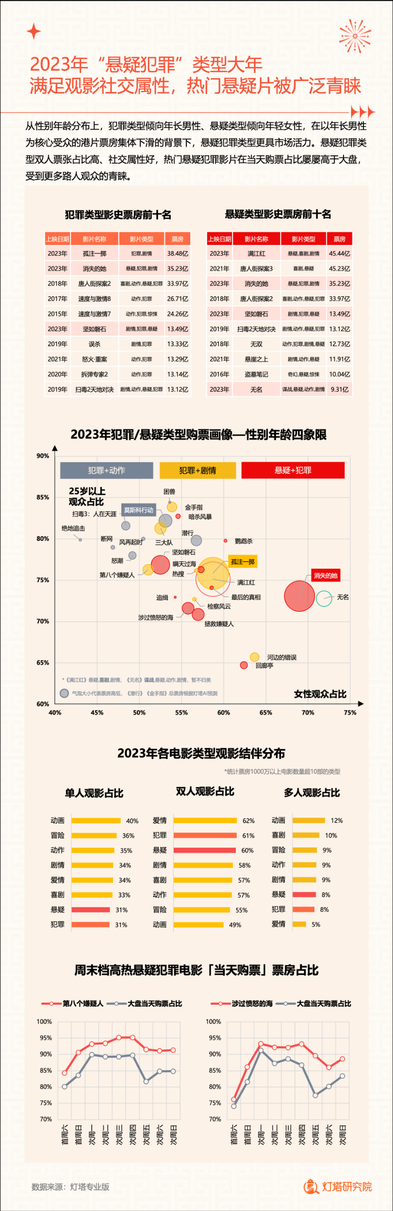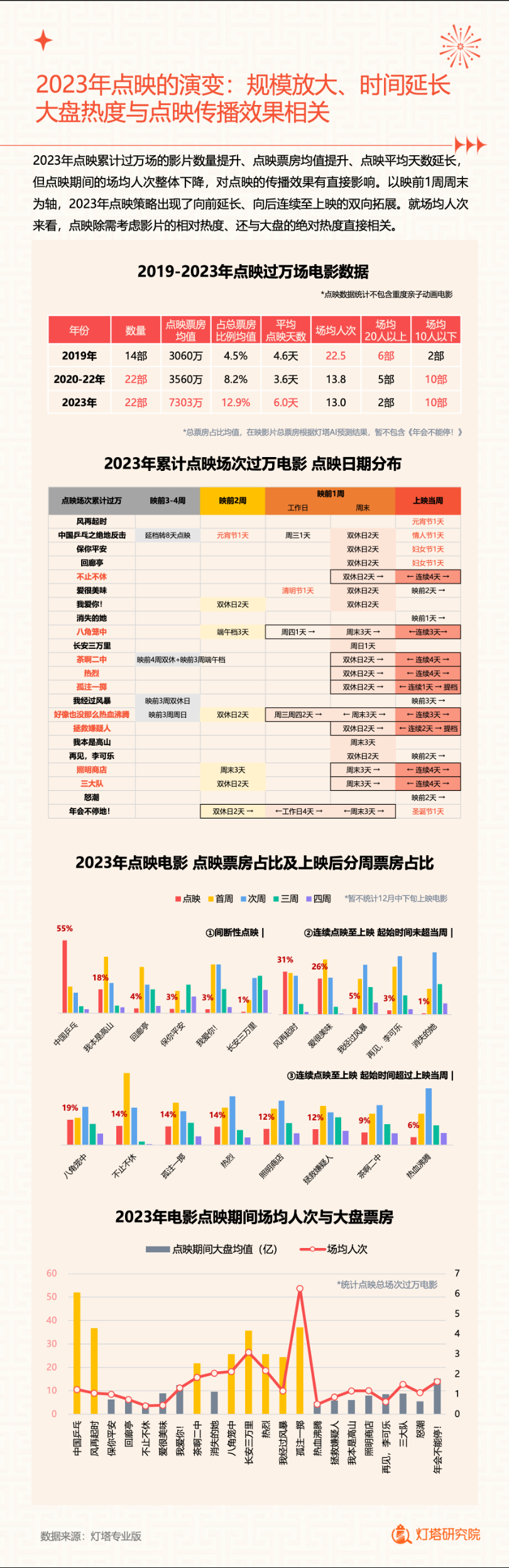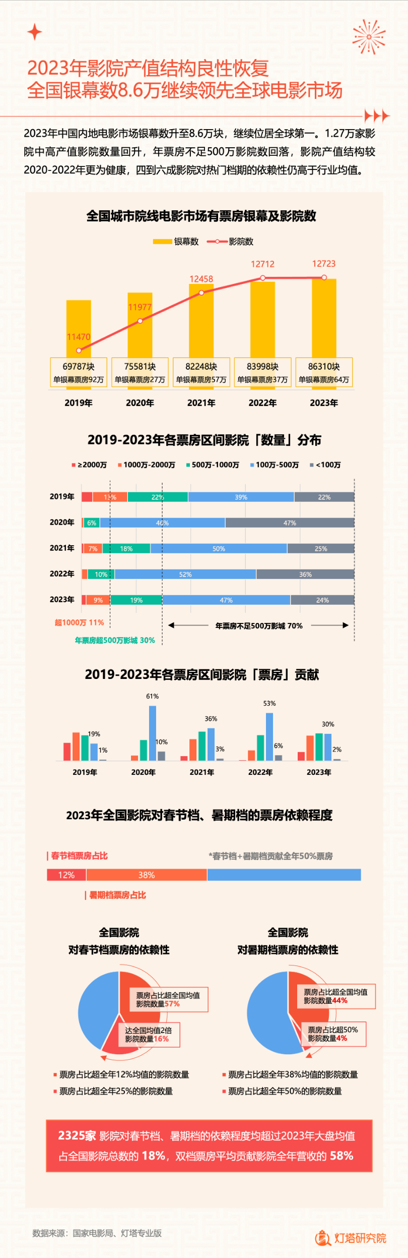 新华网北京1月2日电(记者闫雨昕)2024年1月1日,灯塔研究院联合新华网发布《2023中国电影市场年度盘点报告》(以下简称“报告”),从市场核心数据、观影消费习惯、热门档期与周末档、宣发新风向、用户画像等方面进行分析。