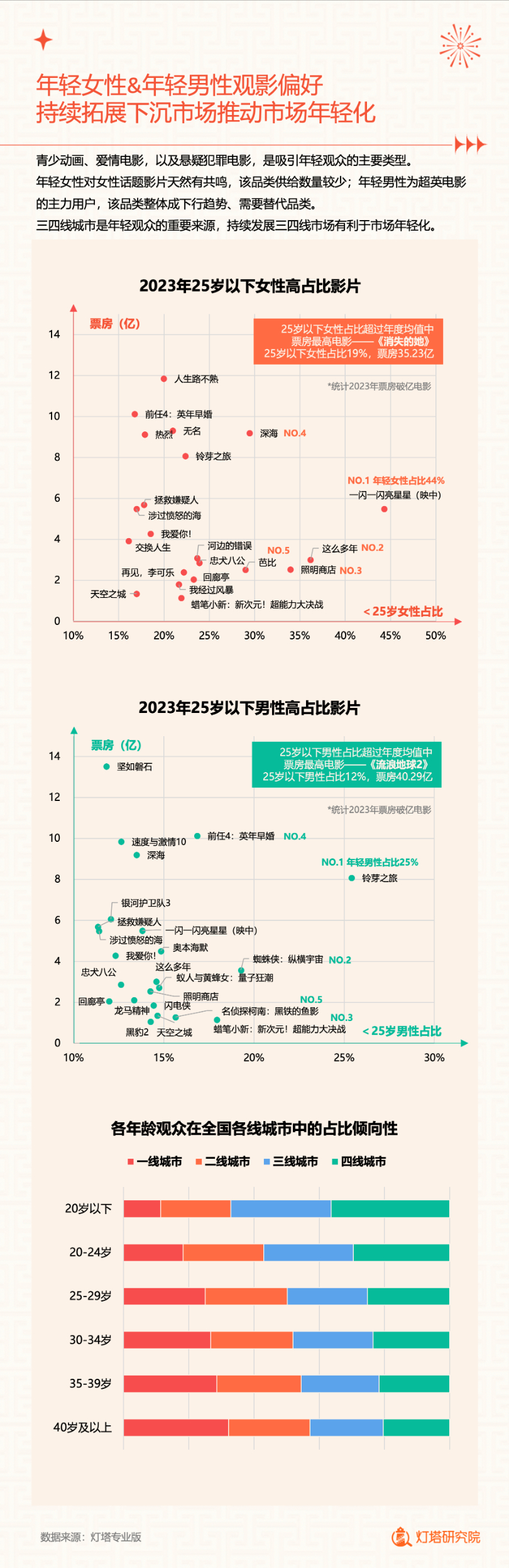 用户画像显示,2023年女性观众占比攀升至58%,女性及成熟女性观影需求逐渐主导市场。下沉市场观影人次继续保持40%以上,三四线城市年票房双双突破100亿。