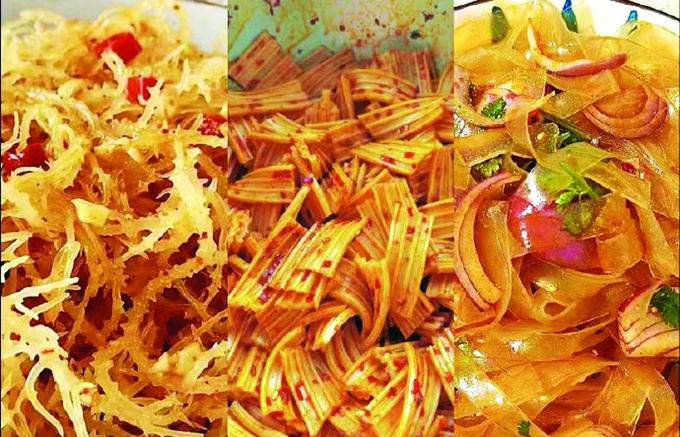 “‘神经末梢’口感脆爽,美味极了。”“‘塑胶跑道’在麻辣拌中味道绝佳,煮火锅也是上佳之选。”“‘透明门帘’特有嚼劲。” “凉菜三巨头”以其独特的口感受到食客们的追捧。