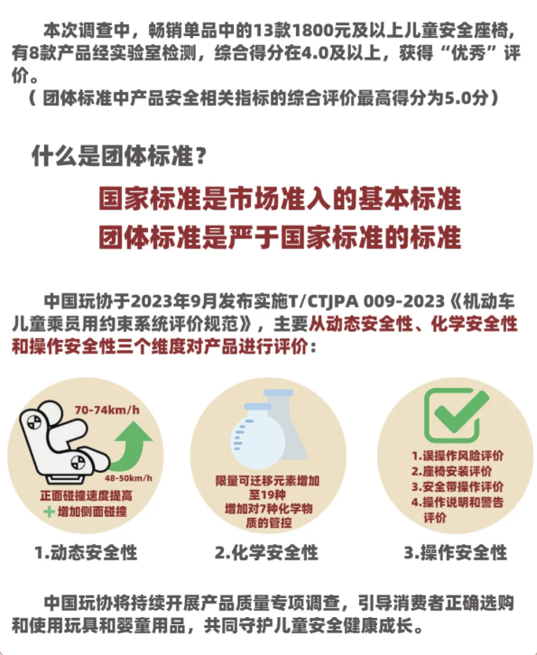 中国玩协针对天猫、京东、抖音、拼多多平台上销量较高的儿童安全座椅开展产品质量专项调查,样品委托取得CMA资质认定和CNAS认可,并承接国家产品质量监督抽查任务的实验室,依据GB 27887-2011《机动车儿童乘员用约束系统》(简称国标)对1800元以下儿童安全座椅进行检测、依据T/CTJPA 009-2023《机动车儿童乘员用约束系统评价规范》(简称团标)对1800元以上儿童安全座椅进行评价。公布结果仅反映此次专项调查情况,不代表行业整体水平。