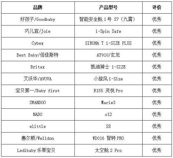 为加快升级儿童安全座椅质量标准,给消费者选购优质产品提供更多参考,中国玩协于2023年9月发布实施的团标采用了比国标更严苛的测试条件:正面碰撞(模拟车祸实际碰撞情形)速度提高到70-74km/h,远高于现有国标要求;参考国际标准增加了侧面碰撞测试,可以更真实的模拟侧面碰撞事故;对更多有害的化学物进行评价,更全面评估儿童安全座椅用料是否环保无污染、对人体是否安全。产品安全相关指标的综合评价最高得分为5.0分。经实验室检测,此次调查的16款产品中所有产品评价都在“良好”及以上,其中12款综合得分在4.0及以上,获得“优秀”评价。具体品牌和产品型号如下: