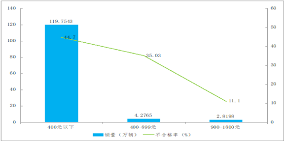 本次摸底调查的儿童安全座椅涵盖400元以下、400-899元以及900-1800元3个价格区间,总计76批次儿童安全座椅,总销量超过120万辆。其中,400元以下儿童安全座椅销量超过100万辆,占比94.4%,该价格区间儿童安全座椅产品不合格率也是此次摸底调查最高,为44.7%;400-899元儿童安全座椅产品不合格率为35.0%;900-1800元儿童安全座椅产品不合格率为11.1%。