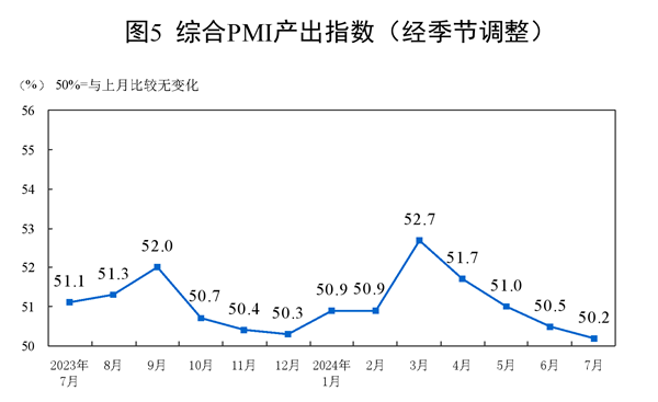 7月份,综合PMI产出指数为50.2%,比上月下降0.3个百分点,仍位于扩张区间,表明我国企业生产经营活动继续保持扩张。