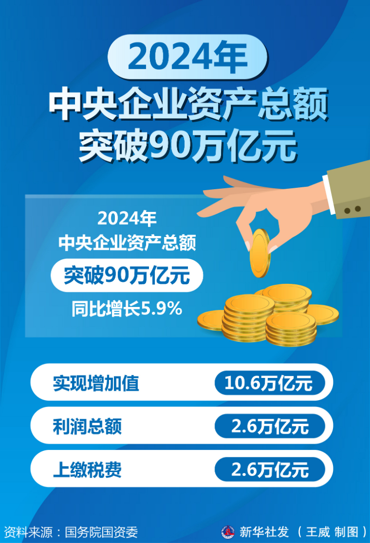 新华社北京1月17日电(记者王希)国务院国资委副主任袁野17日介绍,2024年,中央企业资产总额突破90万亿元,同比增长5.9%;实现增加值10.6万亿元、利润总额2.6万亿元、上缴税费2.6万亿元。