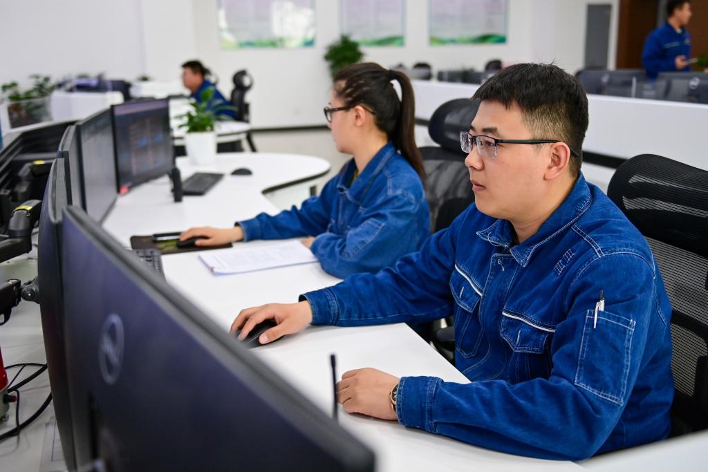 在哈密-重庆±800千伏特高压直流输电工程新疆送端站巴里坤换流站,运检人员在主控室监看运行数据(6月10日摄)。新华社记者丁磊 摄