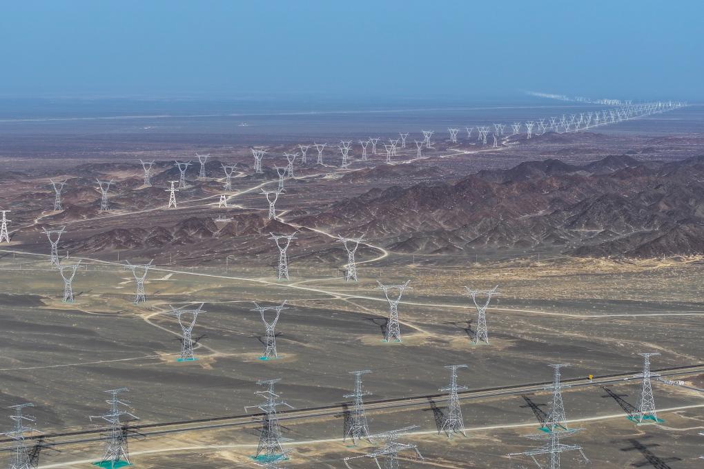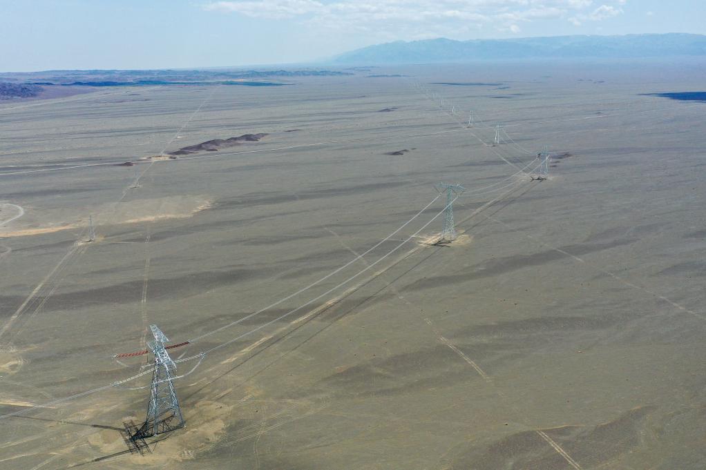 这是6月10日拍摄的哈密-重庆±800千伏特高压直流输电线路(无人机照片)。新华社记者丁磊 摄