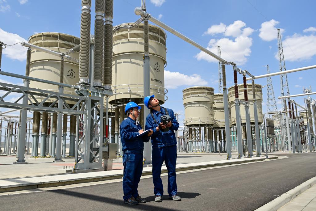6月10日,在哈密-重庆±800千伏特高压直流输电工程新疆送端站巴里坤换流站,运检人员在直流场区域进行紫外放电检查。新华社记者丁磊 摄