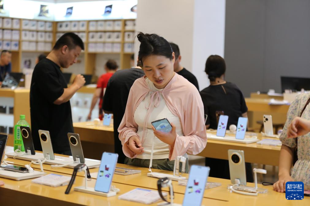 6月15日,顾客在四川省乐山市一大型商场内挑选新款手机。5月份,社会消费品零售总额41326亿元,同比增长6.4%,比上月加快1.3个百分点。新华社发(李华时摄)