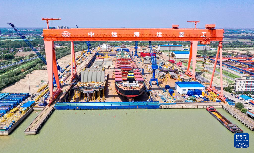 6月16日,工人在位于江苏省扬州市江都区的扬州中远海运重工有限公司生产厂区作业(无人机照片)。5月份,全国规模以上工业增加值同比增长5.8%。新华社发(任飞摄)