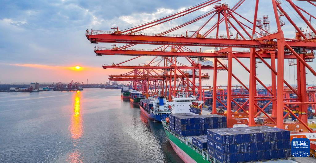 6月16日,轮船停泊在河北唐山港京唐港区集装箱码头作业(无人机照片)。5月份,全国规模以上工业增加值同比增长5.8%。新华社发(刘满仓摄)