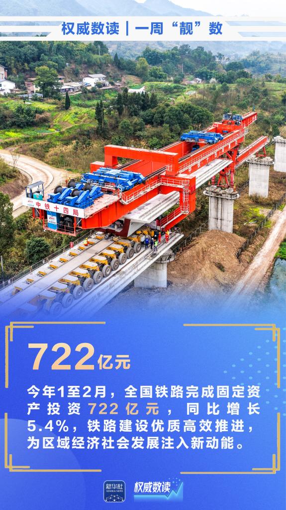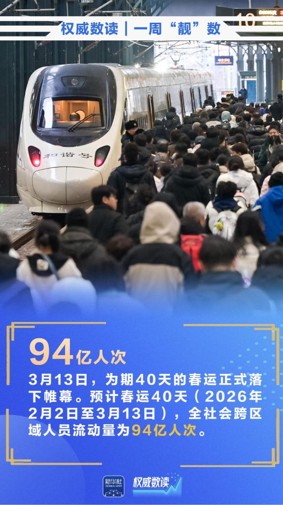 3月13日,为期40天的春运正式落下帷幕,预计春运40天全社会跨区域人员流动量为94亿人次;今年前2个月,我国货物贸易进出口总值7.73万亿元,同比增长18.3%;2月份,我国CPI同比上涨1.3%……本周,这些数据最值得关注!