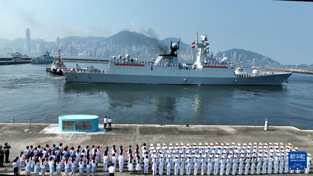 7月7日,湛江舰驶离昂船洲军营码头,士兵分区列队向前来送行的人群挥手告别。新华社发(冯丽 摄)