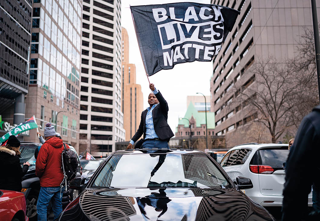 2021年4月20日,得知肖万被控的谋杀和过失杀人等三项罪名全部成立后,民众手举 “黑人的命也是命”标语的旗帜聚集在美国明尼阿波利斯市的法庭附近