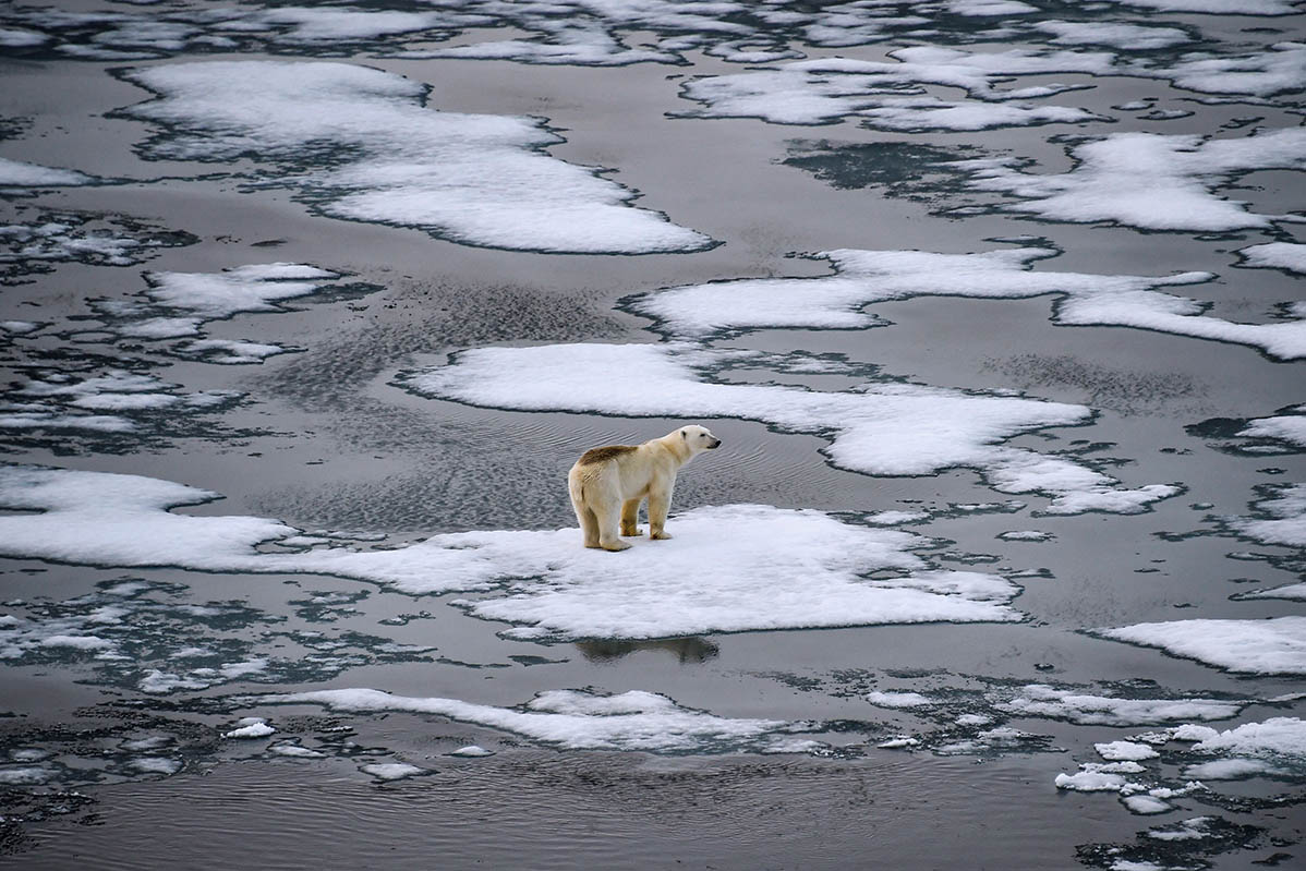 2021年8月16日,在俄罗斯法兰士约瑟夫地群岛拍摄的站在冰上的北极熊