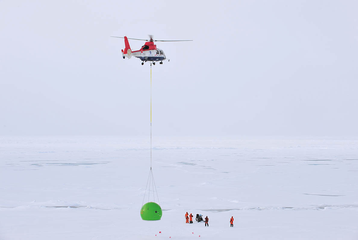 2010年8月8日,中国第四次北极科考队作业过程中,“海豚”直升机将“防熊”的“苹果房”吊运到作业现场