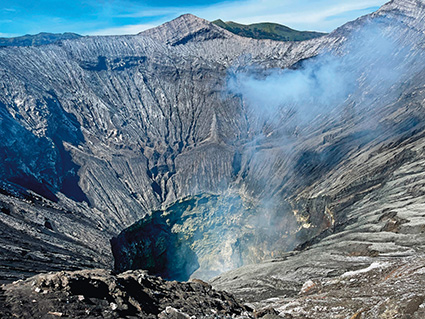 跟随着缓慢前行的人群,我终于爬上了布罗莫火山。深灰色的火山壁棱角分明,白色的烟雾从火山坑里团团涌出。扑面而来一股硫磺味,我仿佛看到坑底岩浆翻滚。千疮百孔的火山表面散发着死亡的气息,巨大的火山坑里有一个未知的世界,让人莫名产生一种窒息的恐惧。
