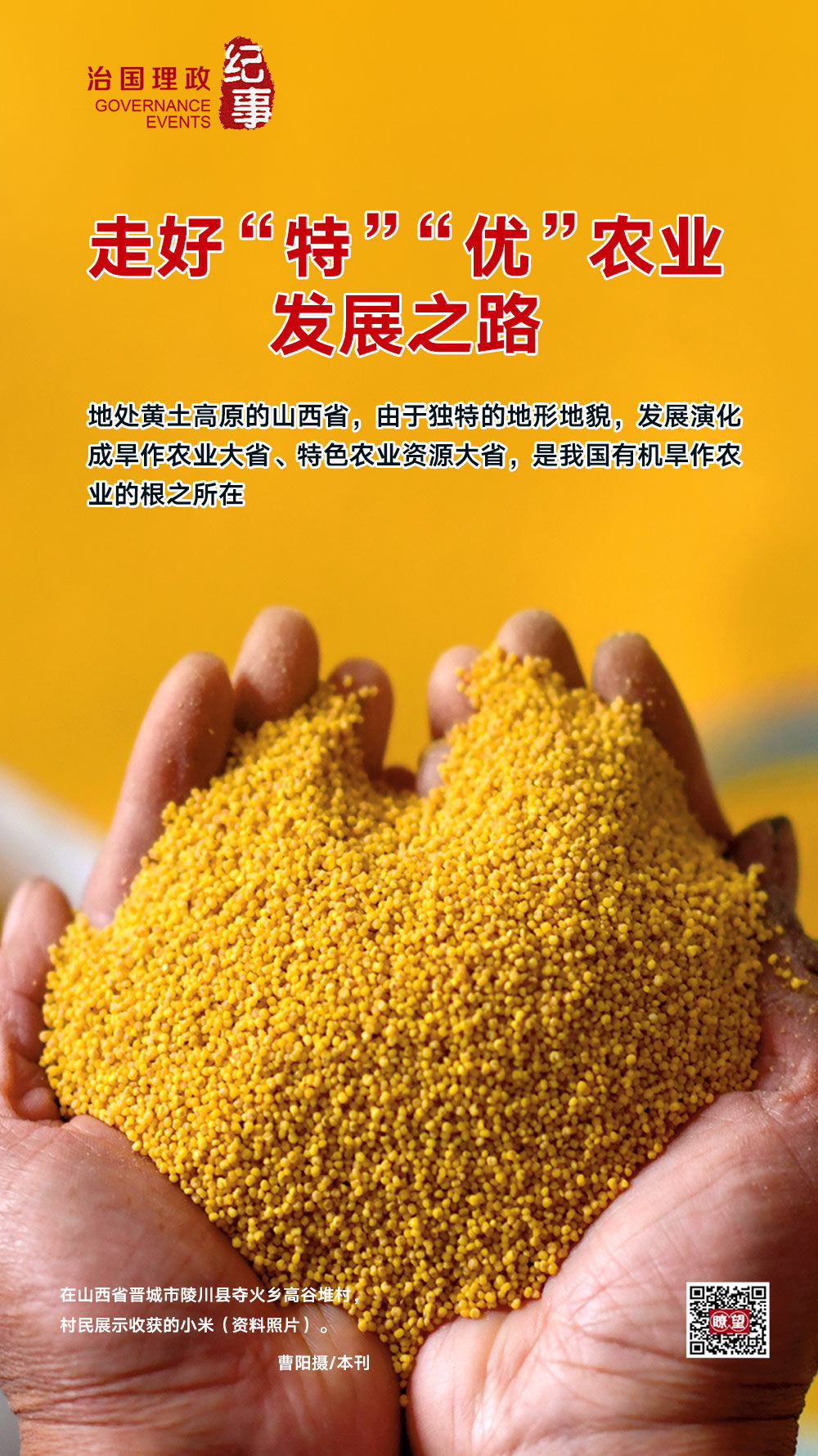 ◇2020年5月,习近平总书记在山西考察时强调,山西山多地多、地貌多元、气候多样,这种独特的资源禀赋决定了山西农业的出路在于“特”和“优”。要深入推进农业供给侧结构性改革,提高农业综合效益和竞争力。