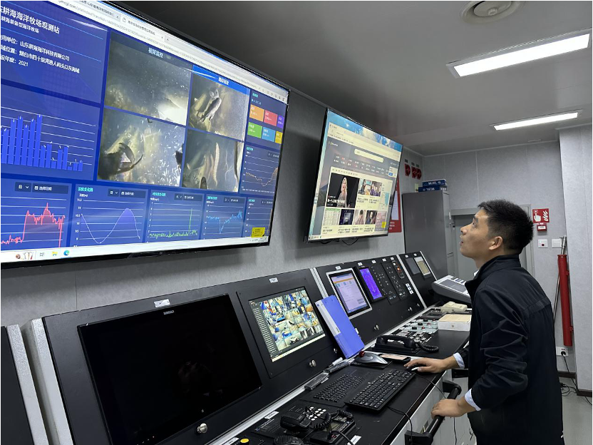 控制大厅里,一块偌大的屏幕上显示着海洋牧场里的鱼儿,同时也显示着养殖水体、鱼饵总量、鱼总量等养殖参数。