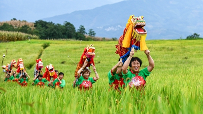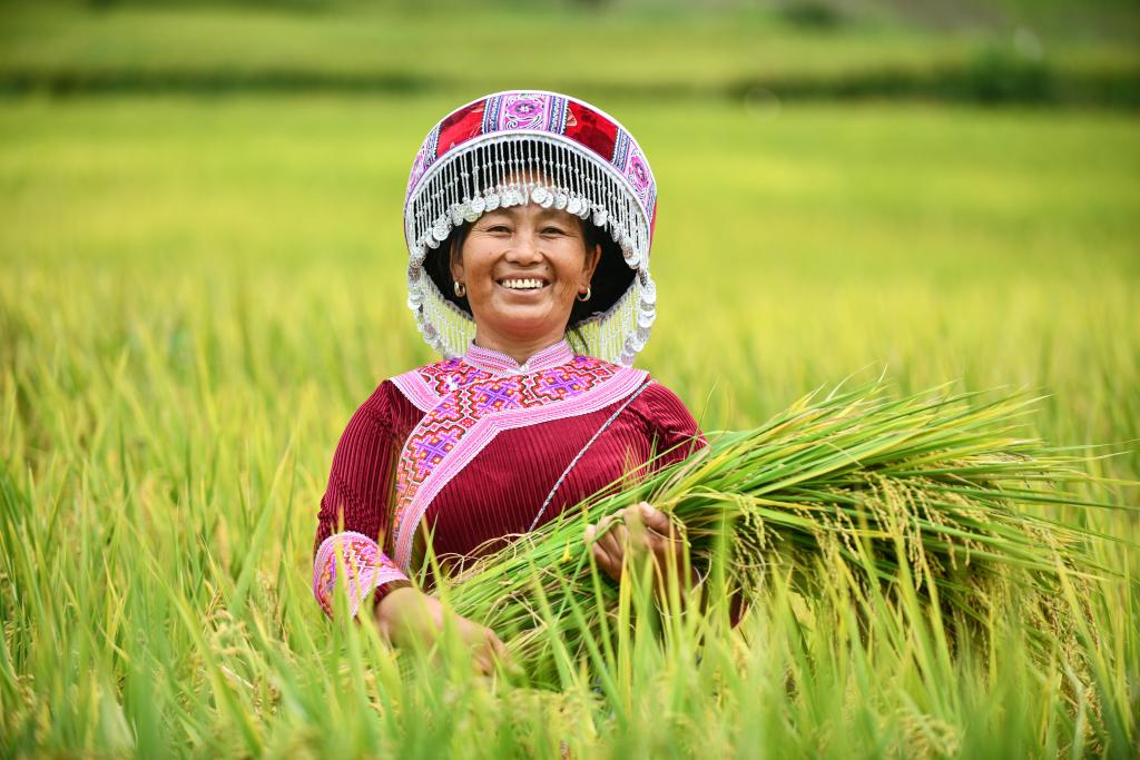 云南红河州个旧市卡房镇对门村村民吴艳芬家的水稻开始收割