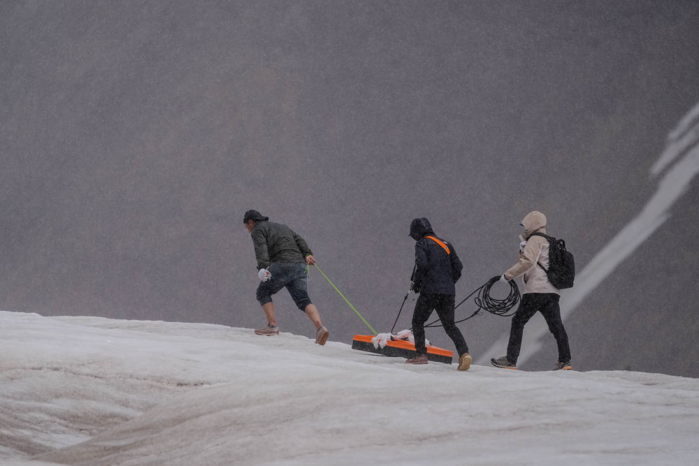 科考队员在冬克玛底冰川上收集样品(2024年7月25日摄)。新华社发(杜笑微 摄)
