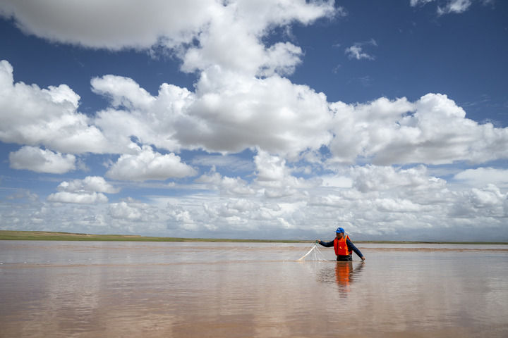 在囊极巴陇,长江科学院流域水环境研究所工程师乔强龙开展现场鱼类生态监测(2024年7月24日摄)。新华社记者 伍志尊 摄
