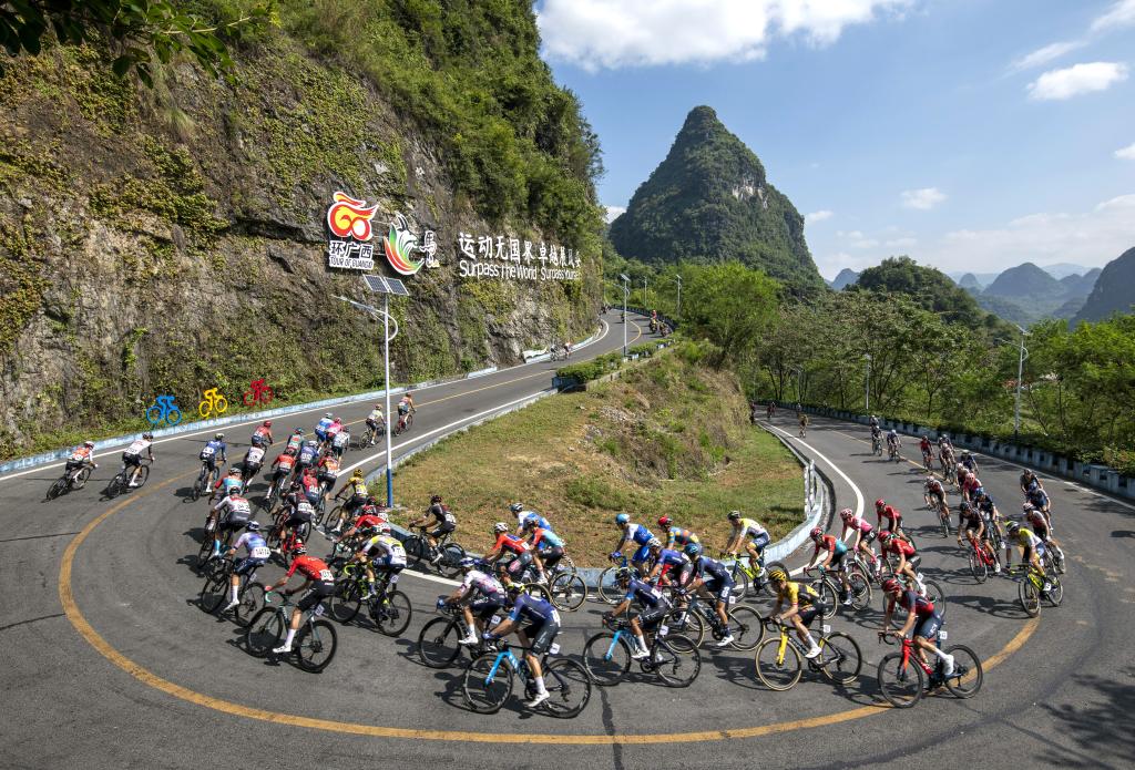 2023年10月15日,运动员参加环广西公路自行车世界巡回赛中的弄拉赛段。