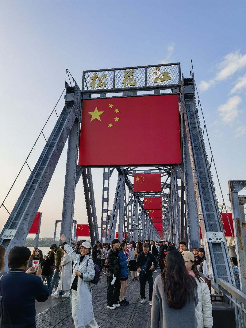 老江桥10年前退役,运输功能让位于旁边并行的新高铁大桥,自己则变身为供人散步休闲并怀古的网红铁桥。刚刚过去的十一假期,沧桑的老江桥上挂满五星红旗,游人纷至沓来,同庆新中国75岁生日,成为社交媒体上刷屏的画面。