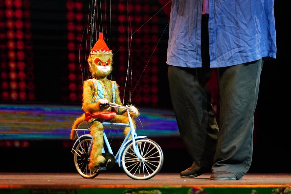 在数十根丝线的操控下,木偶钟馗拎起酒壶,将酒灌入嘴中,打了个嗝后,又捧起酒坛一口气喝光。木偶小猴憨态可掬,伴着音乐声弹起吉他。“通过细线就能让木偶抓稳酒壶、弹起吉他、甚至能骑车,太精妙了!”观众们惊叹不已。