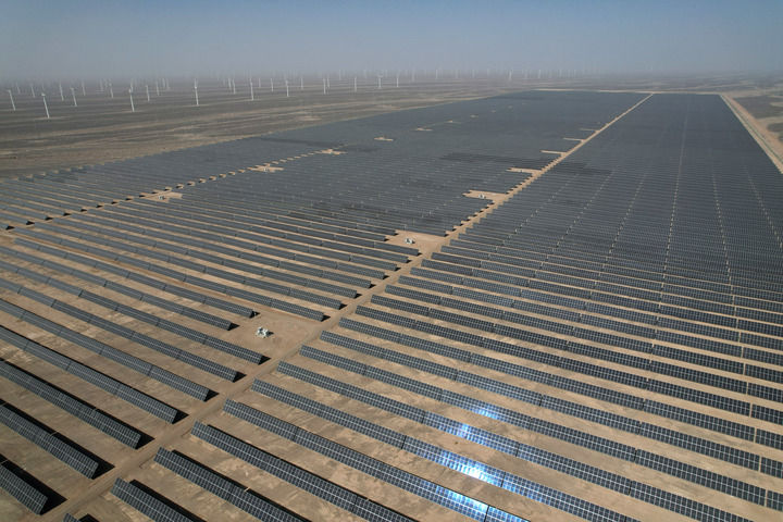 带来巨大经济效益的同时,新能源的生态价值也日益凸显。地处腾格里沙漠南缘的武威市,一种新型治沙模式——光伏治沙由设想变为现实。从高处眺望,武威市凉州区20万千瓦立体光伏治沙产业化示范项目的光伏面板,如同沙海中的碧波清水,光伏板下,沙生植物竞相生长。