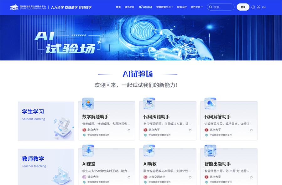 与时俱进,今年,国家智慧教育公共服务平台掌握了“新能力”。人工智能(AI)试验场上,数字解题助手、代码纠错助手、代码解答助手赋能学生学习;AI课堂、AI助教、智能出题助手赋能教师教学;大模型、信息科技平台赋能科学研究……