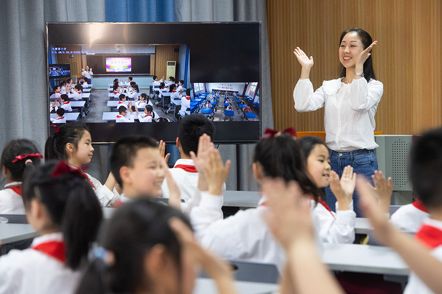 2022年5月16日,在湖北省荆州市沙市大赛巷小学,学生通过“空中课堂”与偏远乡镇的丫角小学一起进行韵律操活动。 新华社记者 肖艺九 摄