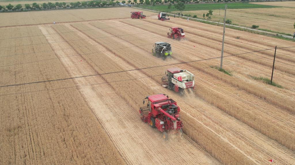 6月1日,山东省临沂市临沭县大兴镇时宅子村的麦田中,小麦收割机正在收麦。新华社发(周瑞 摄)