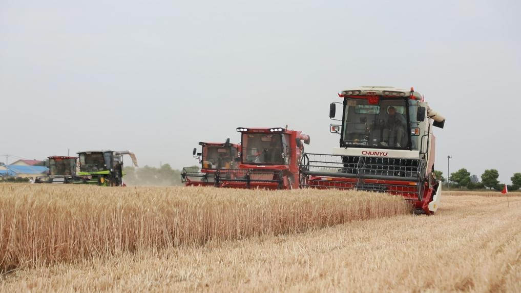 6月1日上午,山东省临沂市临沭县大兴镇时宅子村的麦田中,出发旗帜发出信号后,6台小麦收割机随即匀速前进,驶过的地里只留下短短的麦茬。