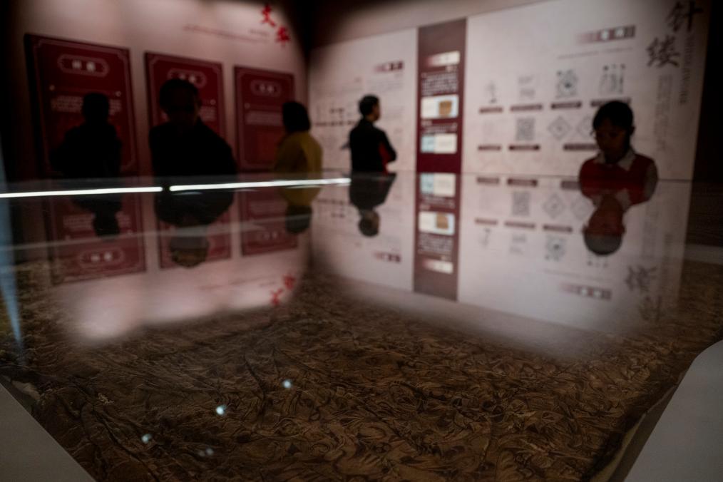 首次全貌展出的蟠龙飞凤纹绣浅黄绢面衾。新华社记者 伍志尊 摄