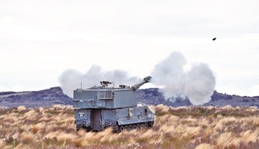 新加坡“普赖莫斯”自行榴弹炮在“霹雳勇士”演习期间进行射击。