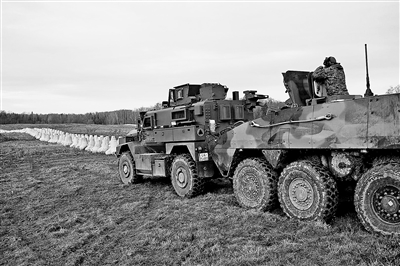 波兰边境上,军用车辆从用于建设防御工事的混凝土障碍物旁驶过。