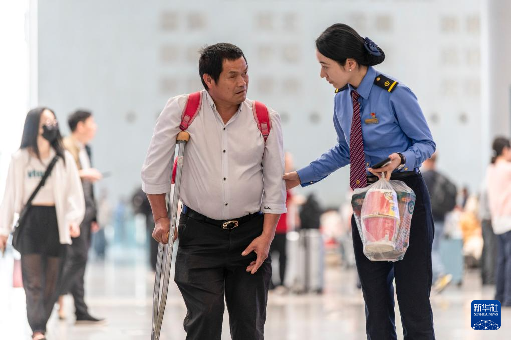 4月29日,在浙江金华站,铁路工作人员帮助行动不便的旅客进站乘车。