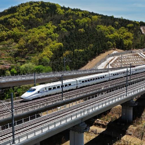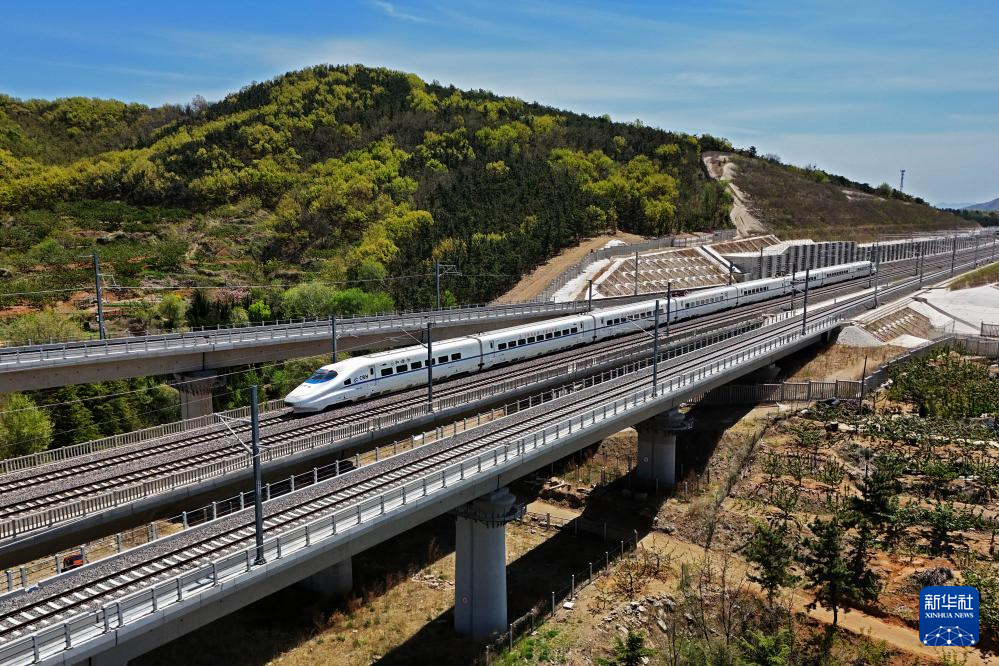 4月29日,动车组列车行驶在山东省烟台市境内(无人机照片)。