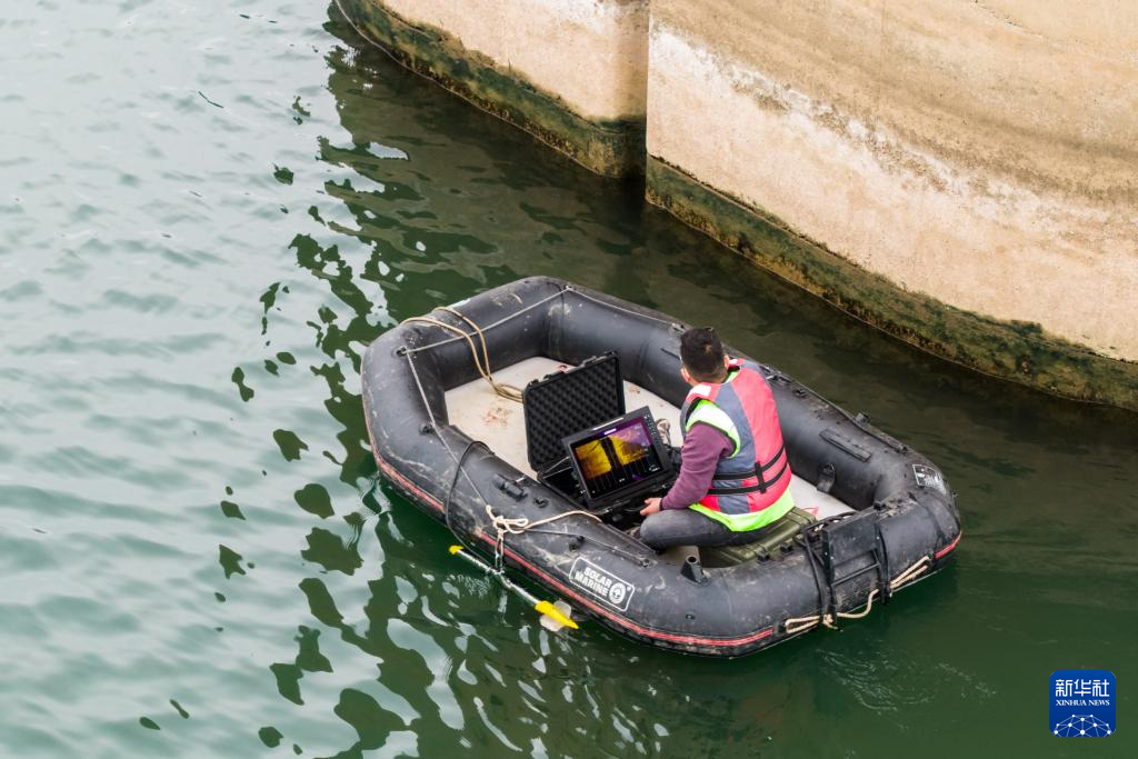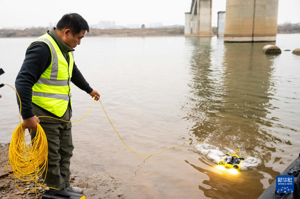 1月29日,在沪昆高铁湘江特大桥下,铁路工人操作水下机器人检测河床情况。