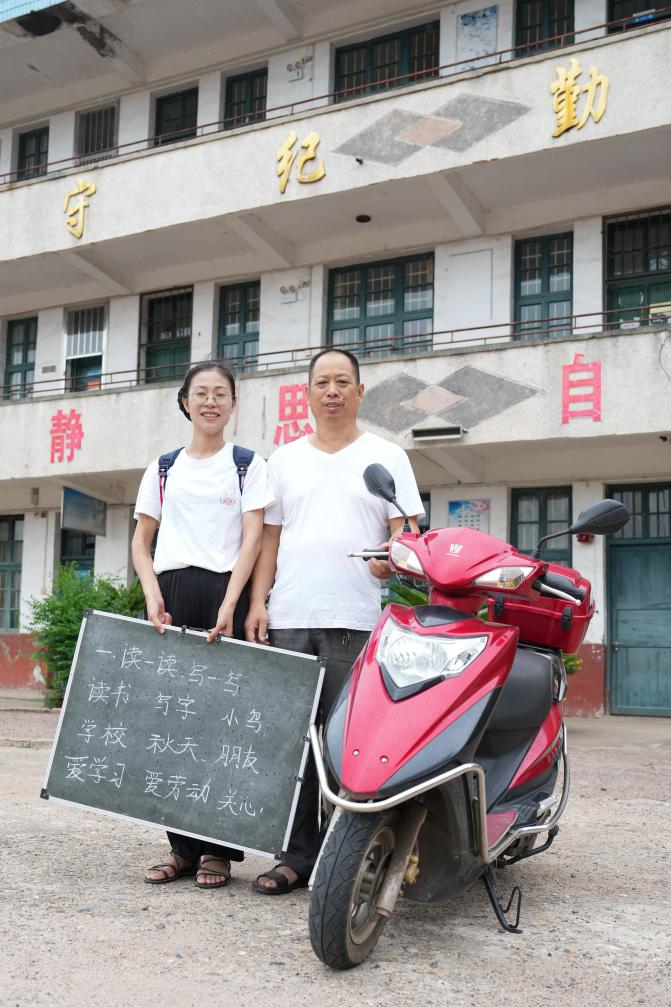 ↑ 2023年9月7日,陈艳辉(左)和父亲陈二文拿着上门送教时使用的小黑板在湖南省株洲市界首中心小学白洲教学点留影。