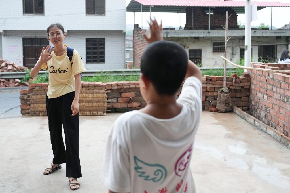 ↑ 2023年8月12日在枧头洲村拍摄的李舒尤(中)和学生们的合影。