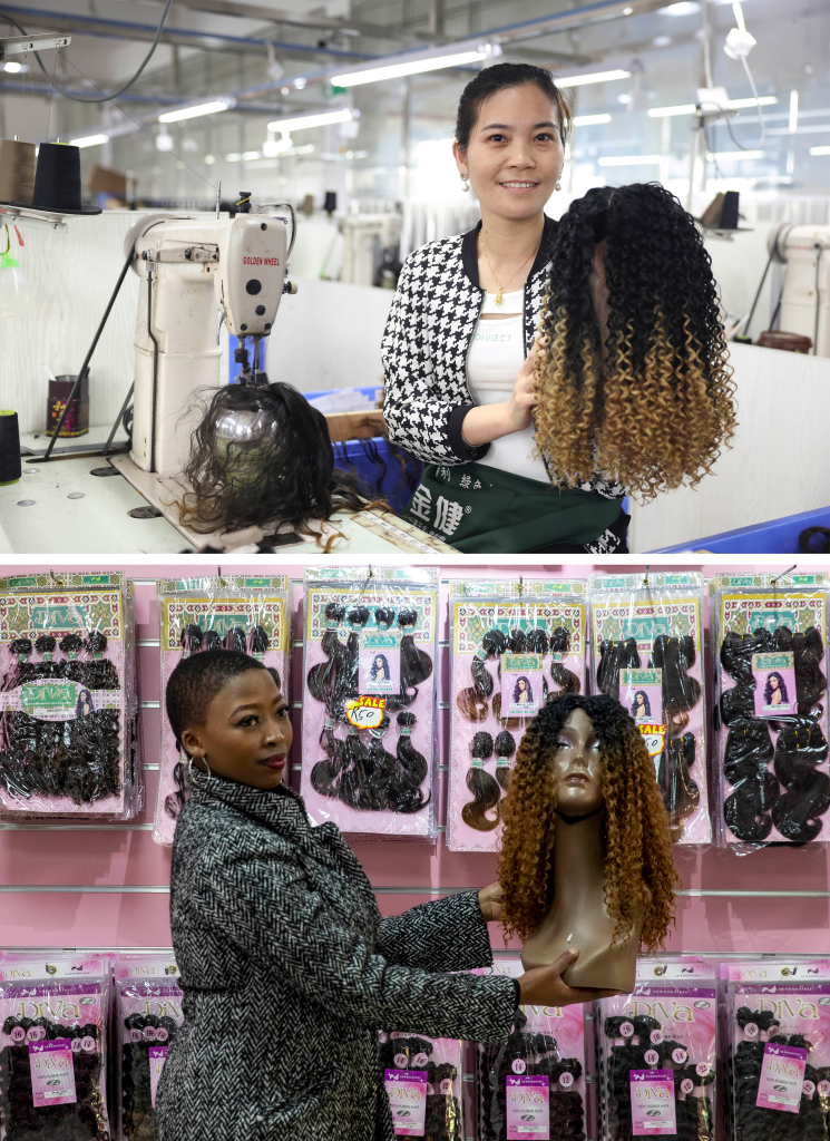 在湖南邵阳,工厂里生产的设计多变、物美价廉的假发出口到非洲,便是当地女性喜爱的时尚单品。