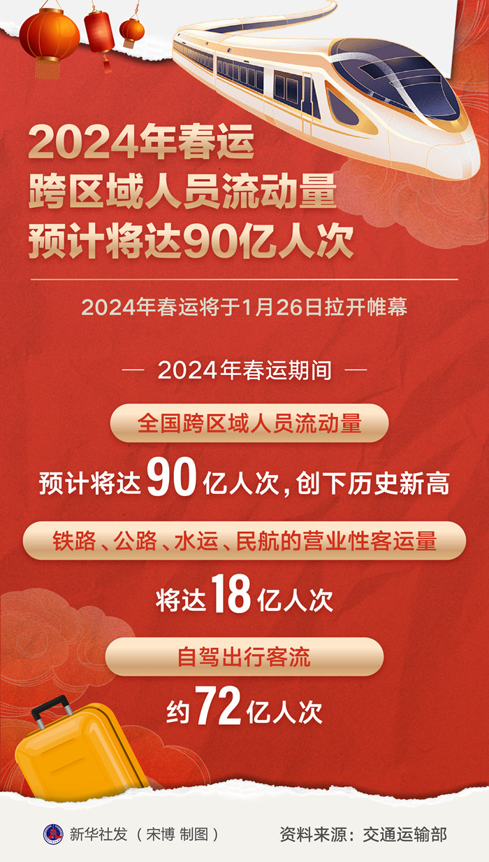 作为疫情防控转段后的第二个春运,今年出行需求大释放。根据预测,今年春运铁路、公路、水路、民航等营业性客运量将达18亿人次,与2023年相比,多2亿多人次。按一个人来回需要乘坐4次车计算,相当于多了5000万人口在流动。
