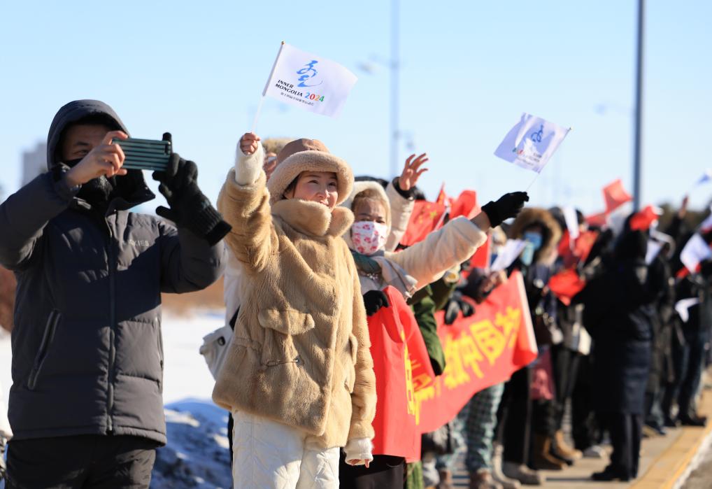 2月3日,在内蒙古呼伦贝尔市举行的“十四冬”火炬传递活动上,路边群众挥手欢呼。新华社发(康文魁摄)