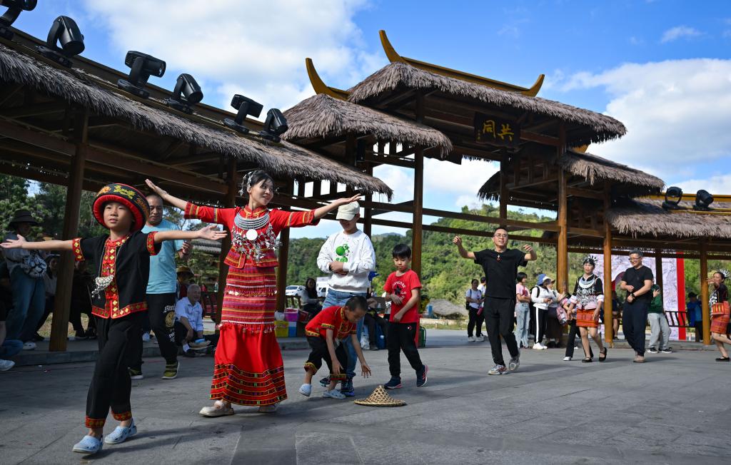 村里广场上,村民王丽冰和姐妹们身着黎族传统服饰载歌载舞,手中的簸箕欢快地移动,里面的茶叶上下翻飞,黎族姑娘采茶炒茶的生动场景跃然展现,赢得游客阵阵掌声。