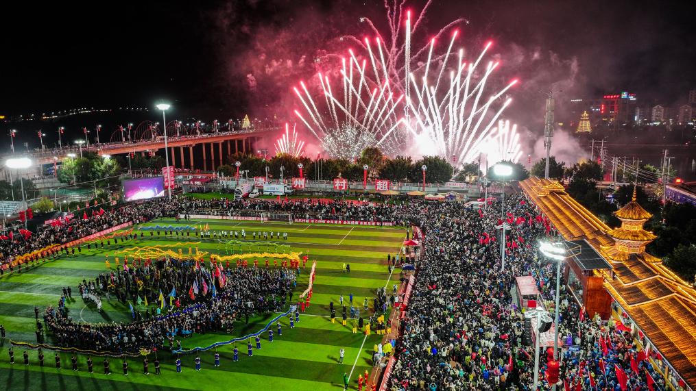 2月3日,音乐烟花秀在榕江县举办的贵州“村超村晚”上演(无人机照片)。新华社记者刘续 摄