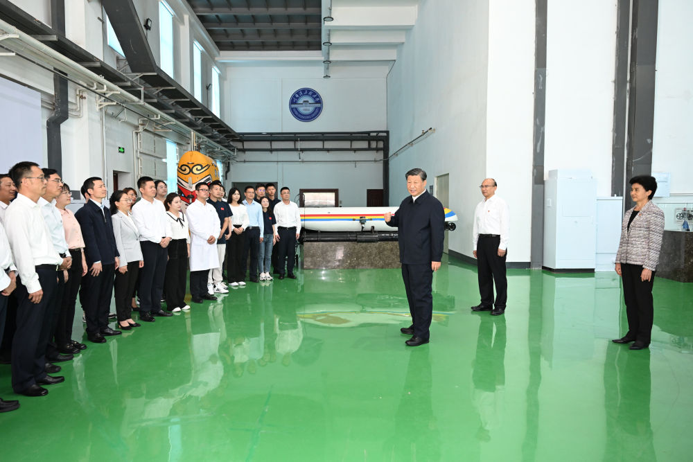 2023年9月6日至8日,习近平在黑龙江考察。这是7日上午,习近平在哈尔滨工程大学考察时,同师生代表亲切交流。